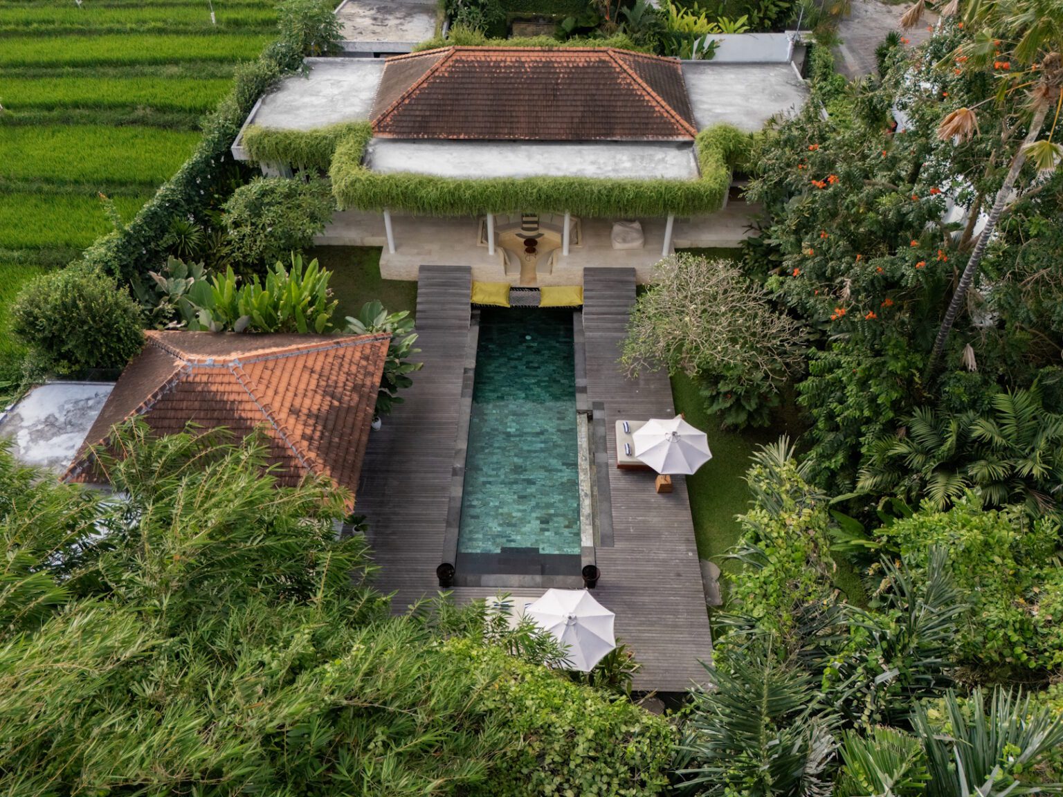 The pool is surrounded by a green lawn and tropical trees. This makes Villa Reina private, secluded, and tranquil. A river flows by the garden, nourishing the nearby rice fields. You feel like you are in the authentic Balinese countryside.